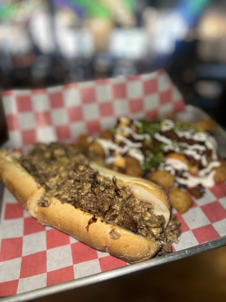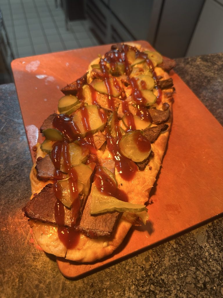 Smoked brisket, cheddar cheese, diced tomato, pickles, red onions, a dill pickle aioli, scallions, & Oklahoma BBQ sauce.