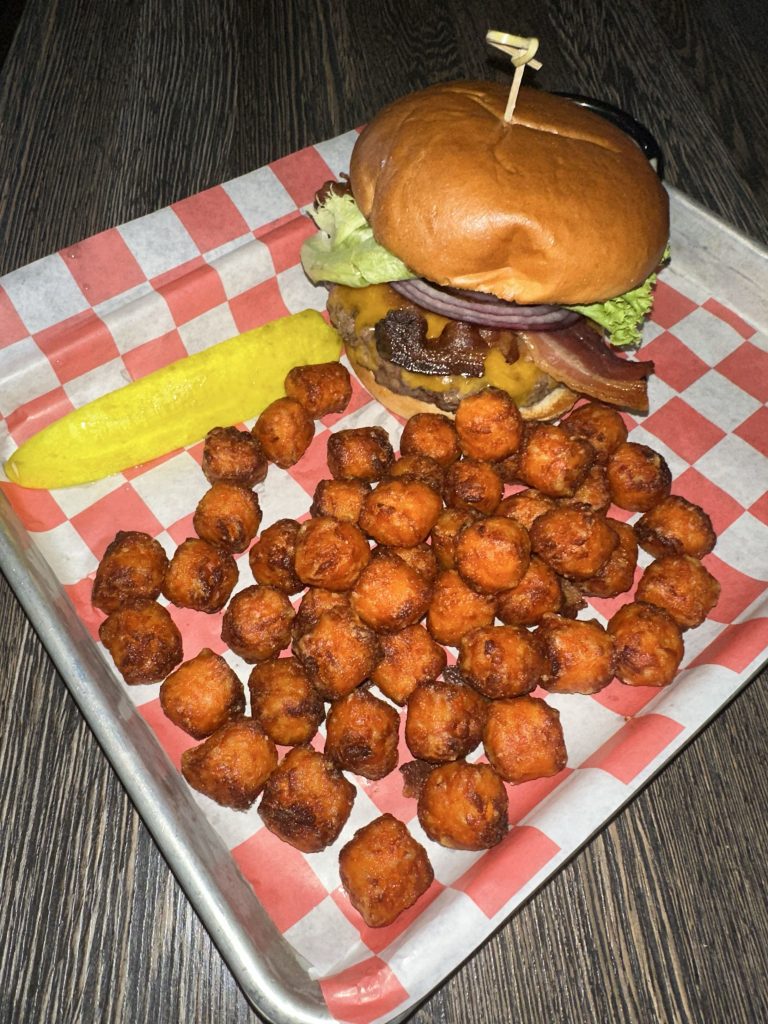 Our Downtown burger served with a cherry pepper relish, roasted red peppers, crispy prosciutto, provolone cheese, arugula, and a garlic aioli.
